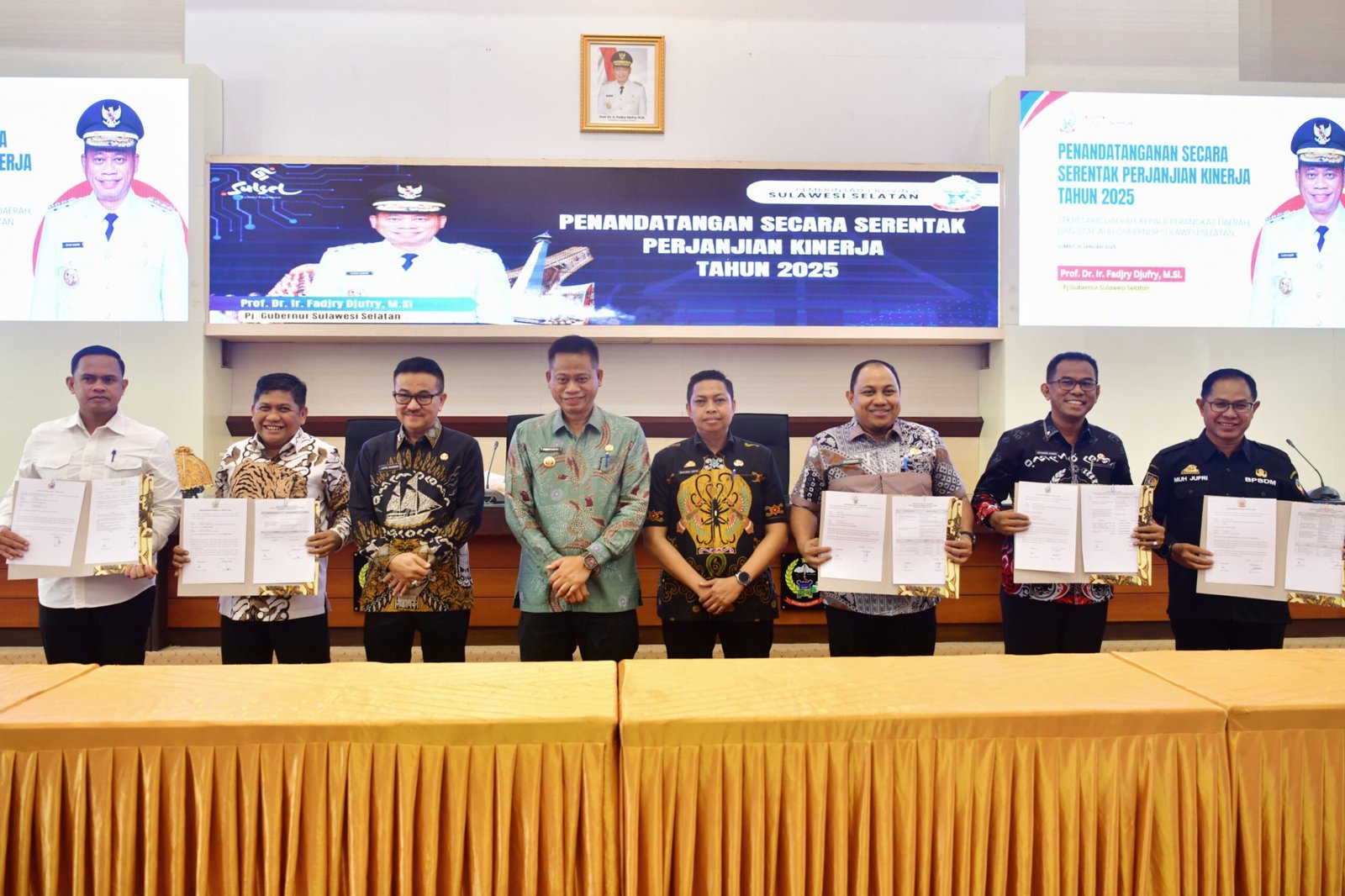 TEBARAN.COM,MAKASSAR – Penjabat Gubernur Provinsi Sulsel, Prof Fadjry Djufry, menyaksikan penandatanganan perjanjian kinerja Sekretaris Daerah Provinsi Sulsel Dr Jufri Rahman dengan Kepala Perangkat Daerah di lingkup Pemerintah Provinsi (Pemprov) Sulsel, di Ruang Rapat Pimpinan Kantor Gubernur Sulsel, Jumat, 31 Januari 2025.