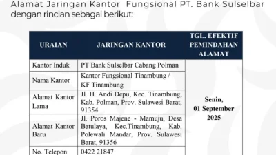 Dalam pengumuman itu disampaikan bahwa terhitung mulai hari Senin, tanggal 1 September 2025, dilakukan pemindahan alamat jaringan kantor Fungsional PT. Bank Sulselbar.