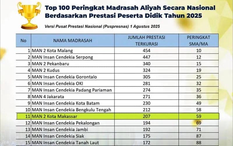 Peringkat Top 100 Nasional dari Puspresnas ini akan menjadi motivasi tersendiri bagi warga MAN 2 Kota Makassar untuk terus meningkatkan mutu dan prestasi.