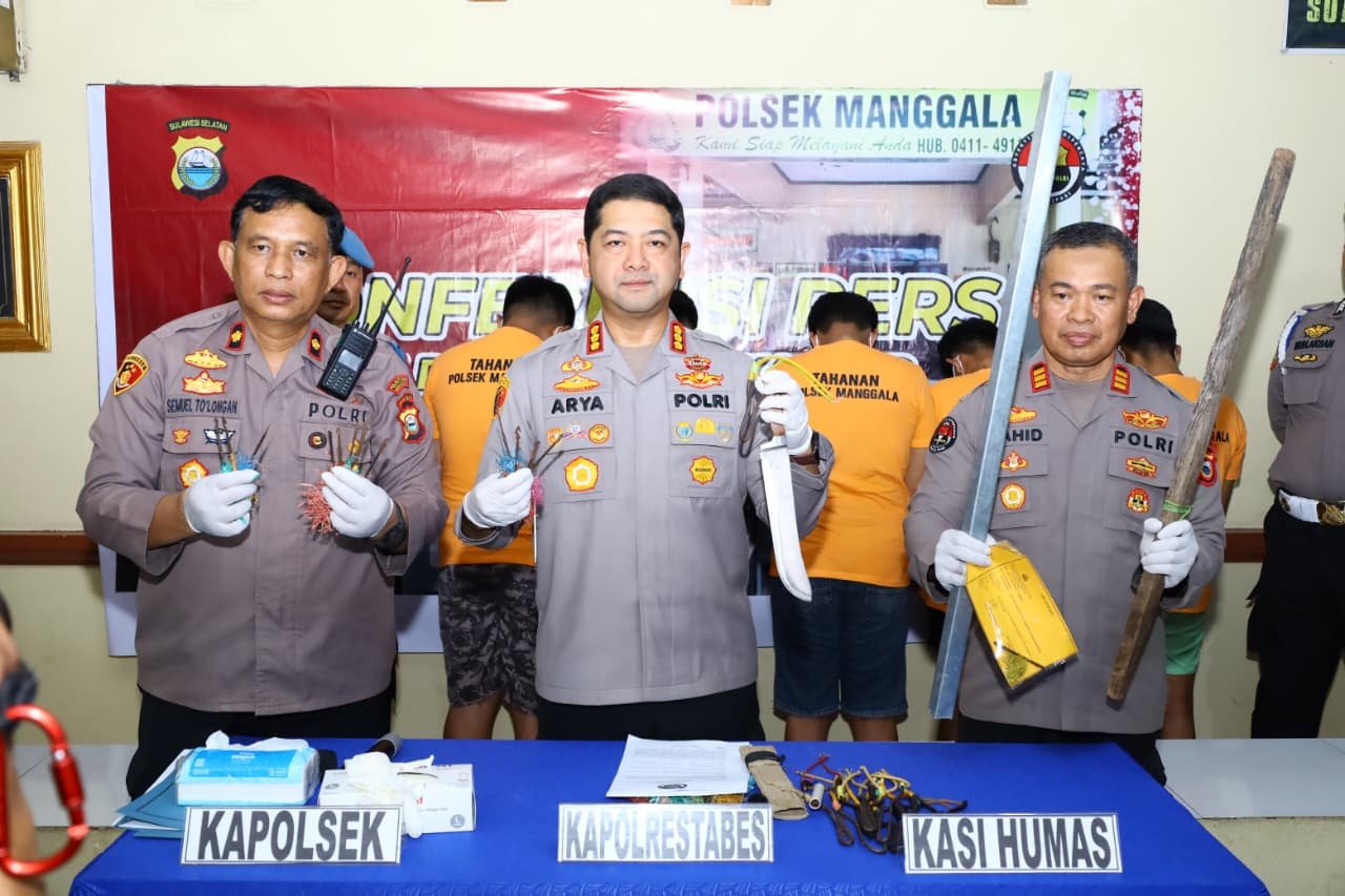 TEBARAN. COM, Makassar – Kapolrestabes Makassar Kombes Pol Arya Perdana, S.H., S.I.K., M.Si. didampingi Kapolsek Manggala Kompol Semuel Tolongan, S.H., M.H., M.Si. dan Kasi Humas AKP Wahiduddin menggelar konferensi pers terkait tindak pidana kekerasan secara bersama-sama terhadap orang di muka umum, bertempat di Mapolsek Manggala, Kamis (09/10/2025).
