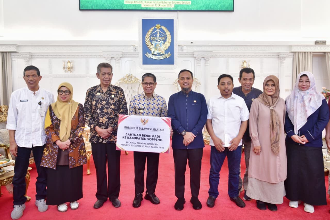 MAKASSAR – Gubernur Sulawesi Selatan, Andi Sudirman Sulaiman, secara simbolis menyerahkan bantuan mandiri benih padi untuk musim tanam Oktober 2025–Maret 2026 kepada Kabupaten Soppeng dan Sidrap.