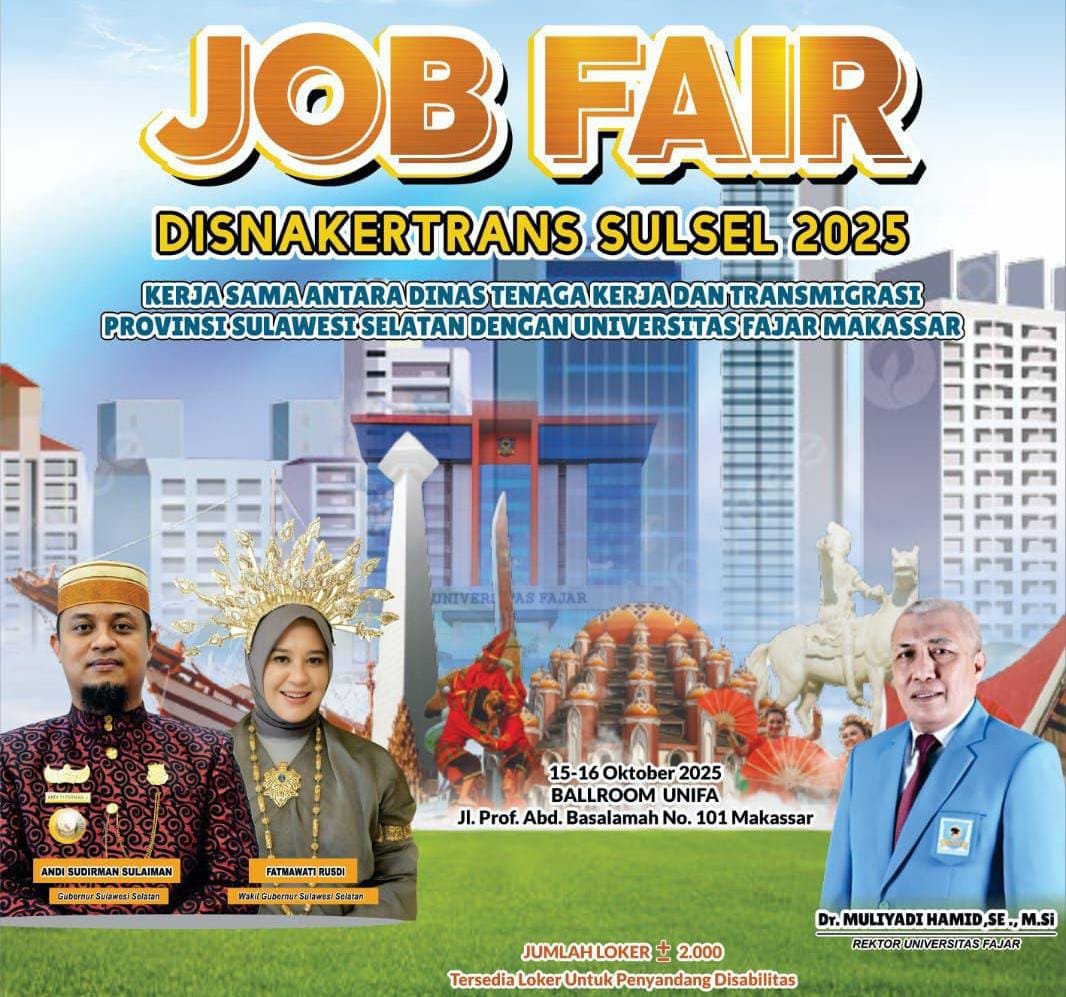 Kegiatan Job Fair Sulsel 2025 dilaksanakan bekerja sama dengan Universitas Fajar (Unifa) dan akan berlangsung selama dua hari, 15–16 Oktober 2025, bertempat di Ballroom Universitas Fajar, Jalan Prof. Abd. Basalamah, Kota Makassar.
