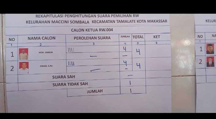 TEBARAN.COMMAKASSAR – Pemilihan Ketua RW 004 di Kelurahan Maccini Sombala, Kecamatan Tamalate, Kota Makassar berlangsung tegang setelah dua kandidat, Mohammad Amilin dan Iswan, memperoleh jumlah suara yang sama. Keduanya mendapatkan 4 suara dari para Ketua RT yang memiliki hak pilih.