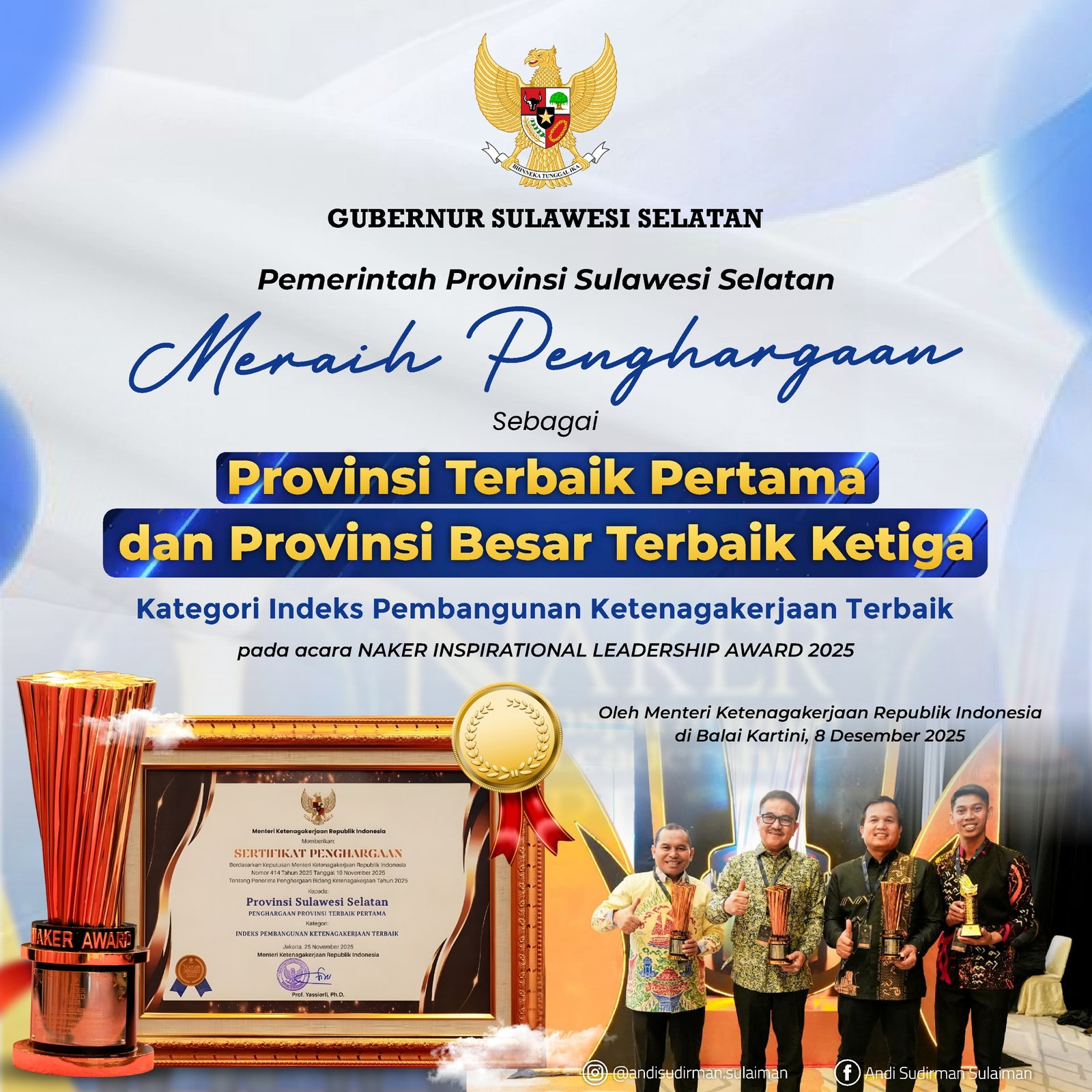 “Alhamdulillah, Pemerintah Provinsi Sulawesi Selatan meraih penghargaan sebagai Provinsi Terbaik Pertama dan Provinsi Besar Terbaik Ketiga untuk Kategori Indeks Pembangunan Ketenagakerjaan Terbaik pada kegiatan Naker Inspirational Leadership Award 2025,” ujarnya.