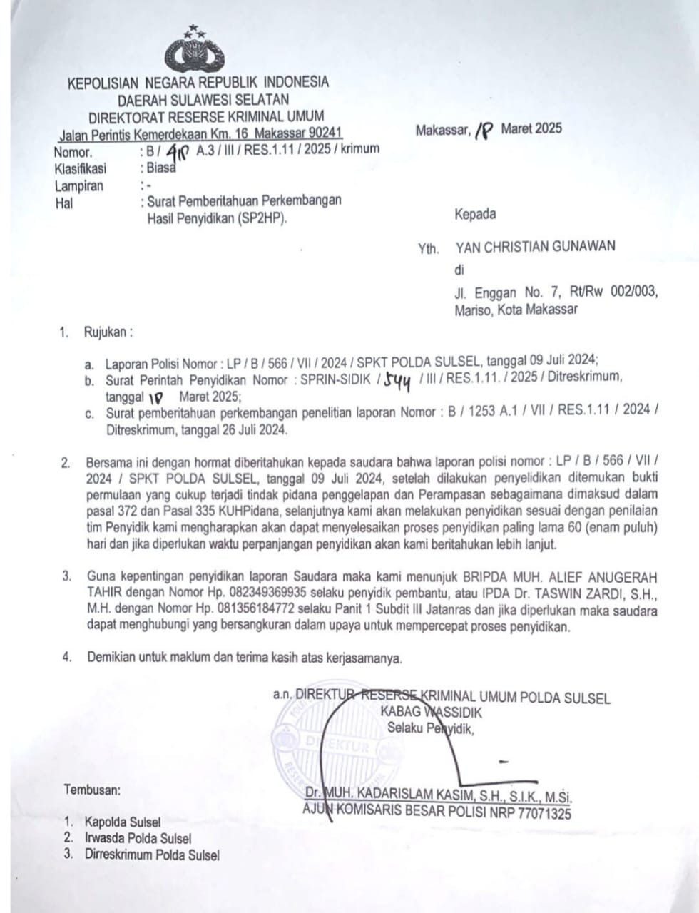 Kasus ini resmi dilaporkan dengan Nomor: STTLP/B/566/VII/2024/SPKT/POLDA SULAWESI SELATAN, dan kedua terlapor dikabarkan telah ditetapkan sebagai tersangka dalam perkara dugaan tindak pidana penggelapan.