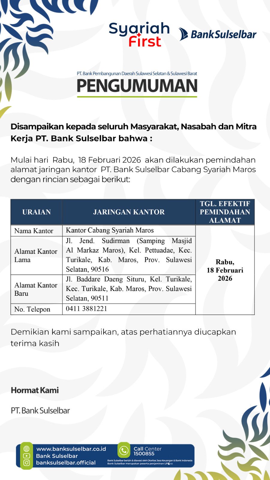 Pengumuman : Disampaikan kepada seluruh masyarakat,nasabah dan mitra kerja PT.Bank Sulselbar :