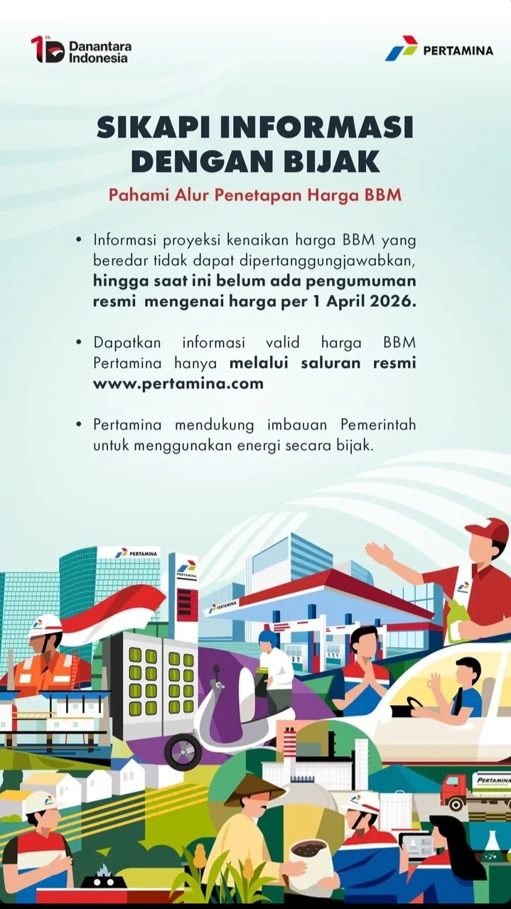 “Informasi proyeksi kenaikan harga BBM yang beredar tidak dapat dipertanggungjawabkan, hingga saat ini belum ada pengumuman resmi mengenai harga per 1 April 2026,” tulis Pertamina dalam unggahan tersebut.