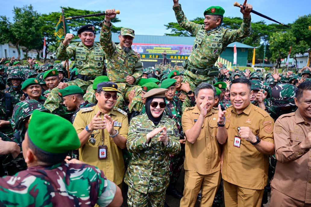 TEBARAN.COM, GOWA — Suasana penuh semangat dan euforia mewarnai fase akhir pelaksanaan Upacara Pembukaan Latihan Dasar Kemiliteran (Latsarmil) Komponen Cadangan (Komcad) Aparatur Sipil Negara (ASN) Tahun 2026 di Rindam XIV/Hasanuddin, Pakatto, Kabupaten Gowa, Senin, 30 Maret 2026. Di tengah riuhnya yel-yel peserta, Wakil Gubernur Sulawesi Selatan, Fatmawati Rusdi, turut masuk ke barisan dan berbaur bersama peserta. Momen tersebut menjadi simbol kedekatan antara pimpinan dan peserta pelatihan.