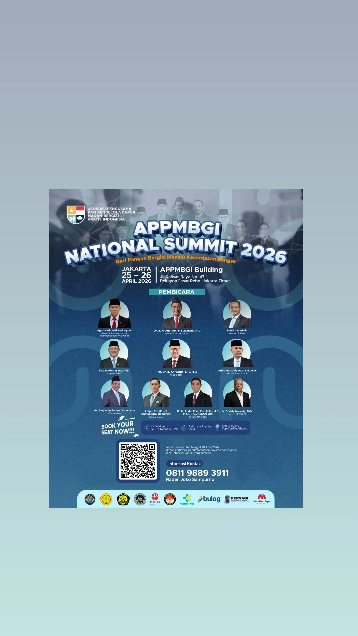 Acara berskala nasional ini akan diselenggarakan oleh Asosiasi Pengusaha dan Pengelola Dapur Makan Bergizi Gratis Indonesia (APPMBGI) pada Sabtu-Minggu, 25-26 April 2026 mendatang di Gedung APPMBGI, Jalan Kalisari Raya No. 47, Jakarta Timur.
