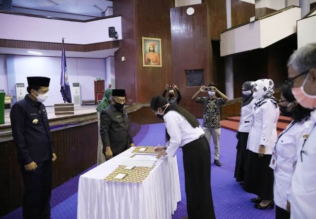 Sebelum pengambilan sumpah jabatan di gelar, di adakan terlebih dahulu penanda tanganan pakta integritas agar capaian kinerja ke depannya bisa sesuai dengan yang di harapkan. (rls)