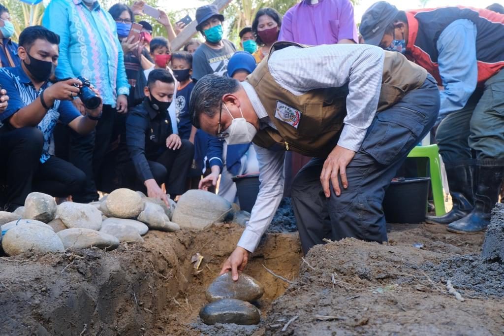 RAGAM.ID, MAKASSAR — Gubernur Sulawesi Selatan, Prof. HM Nurdin Abdullah dan Bupati Luwu Utara, Indah Putri Indriani melakukan peletakan batu pertama pembangunan Hunian Tetap (Huntap) bagi korban banjir bandang Lutra di Dusun Panampung, Desa Radda, Kecamatan Baebunta, Kamis, 17 September 2020.