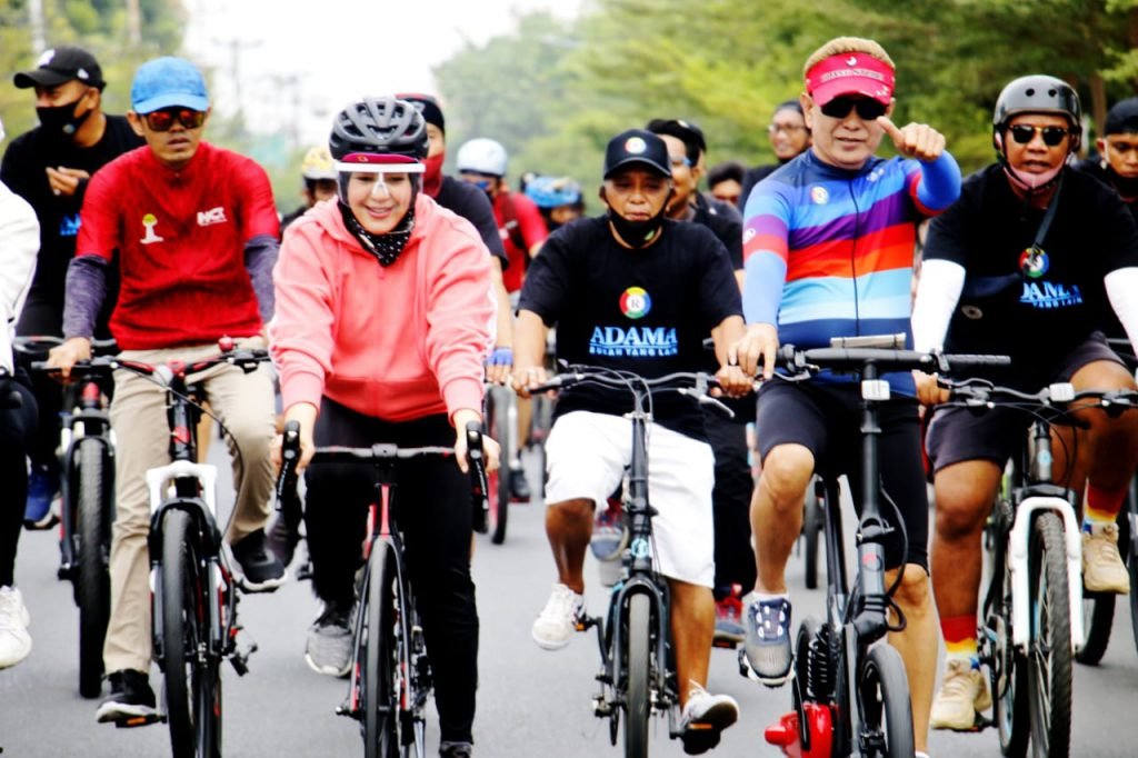 RAGAM.ID, MAKASSAR – Fatmawati Rusdi memanfaatkan momen akhir pekan dengan berolahraga. Sepeda santai jadi pilihan untuk menyelingi rutinitas yang begitu padat. Selain menjaga kebugaran, juga bentuk sosialisasi meningkatkan daya tahan tubuh di tengah pandemi Covid-19.