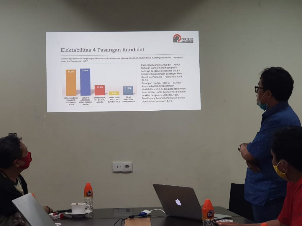 “Pasangan Appi-Rahman menempati posisi tertinggi dengan elektabilitas 35,8 persen bersaing ketat dengan pasangan Danny-Fatma yang memperoleh elektabilitas sebesar 34,5 persen,” kata Direktur Profetik Institute, Muh Asratillah Senge dalam ekspose surveinya di Coffee Lovers, Makassar, Minggu (4/10/2020).