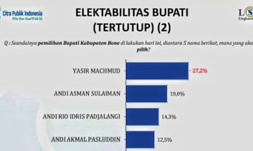 Hasilnya, lembaga konsultan dan riset politik nasional yang dipimpin Denny JA dan lembaga survei yang menempati posisi teratas dalam tingkat kepercayaan publik itu, termasuk survei dalam Pilpres, menempatkan bakal calon bupati Yasir Machmud pada urutan pertama disusul Andi Asman di tempat kedua.