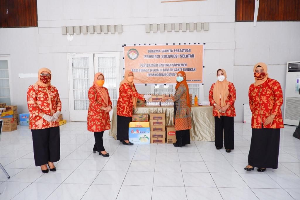 RAGAM.ID, MAKASSAR – Dharma Wanita Persatuan (DWP) Provinsi Sulawesi Selatan (Sulsel) memberi bantuan suplemen bagi tenaga medis di rumah sakit rujukan penanganan Covid-19. Bantuan diserahkan secara simbolis, di Aula Rujab Sekda Provinsi Sulsel, Sabtu, 18 April 2020.