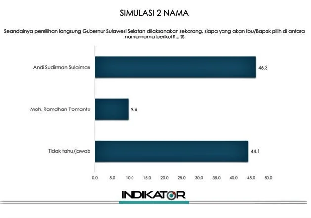 TEBARAN. COM, MAKASSAR – Lembaga survei Indikator merilis hasil survei pemilihan gubernur (pilgub) Sulawesi Selatan (Sulsel) 2024. Hasilnya elektabilitas Andi Sudirman Sulaiman meraih 46,3 persen. Elektabilitas Andi Sudirman Sulaiman ini jauh mengungguli rivalnya, Moh. Ramdhan ‘Danny’ Pomanto yang hanya meraup angka 9,6 persen. Sedangkan responden yang tidak menjawab/tidak tahu sebesar 44,1 persen.