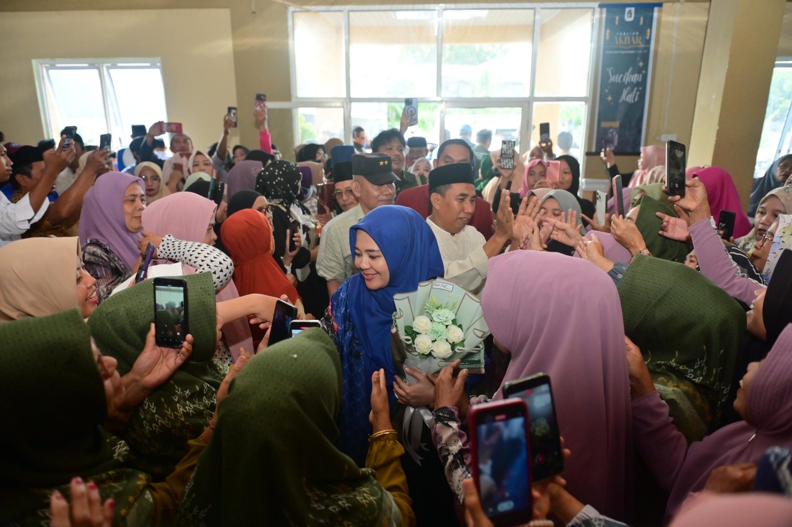 Disambut lantunan selawat puluhan santri Pondok Modern Nurul Asafa, Fatmawati langsung dikerumuni para jemaah yang antusias mengabadikan momen bersama dengan ponsel.