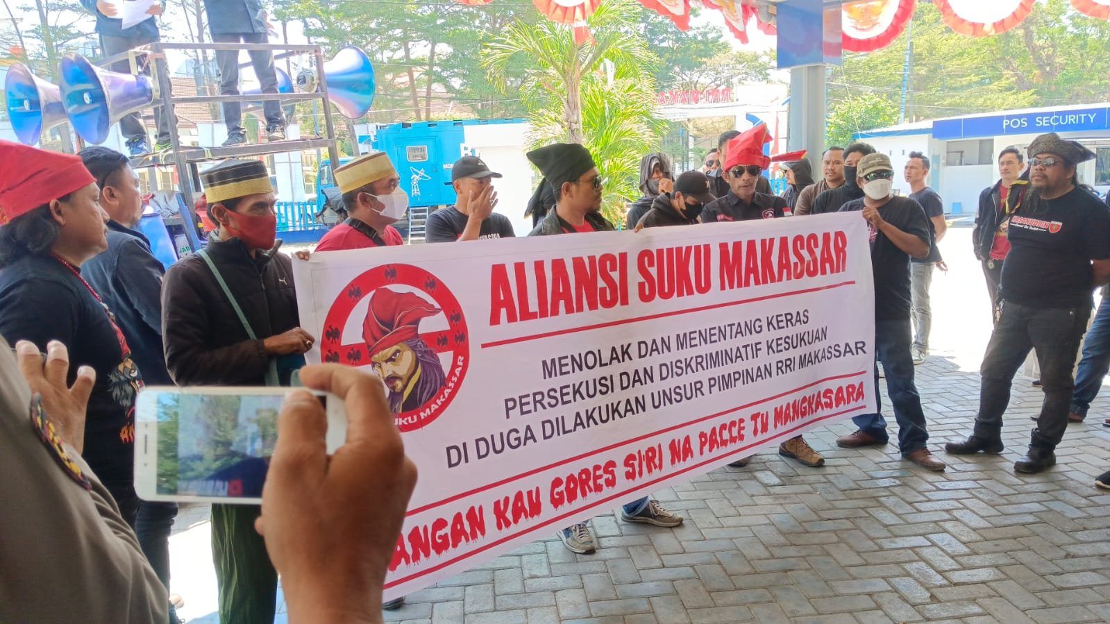 TEBARAN.COM,MAKASSAR – Aliansi suku Makassar sekitar 50 orang mendatangi kantor wilayah RRI Kota Makassar dan melakukan orasi di depan halaman Instansi RRI.