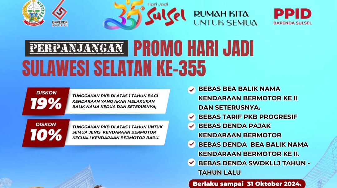 TEBARAN.COM,MAKASSAR – Badan Pendapatan Daerah (Bapenda) Sulsel memberikan diskon pajak kendaraan hingga 19 persen. Diskon ini diberikan dalam rangka memperingati Hari Ulang Tahun (HUT) Sulsel ke-355 tahun, yang jatuh pada 19 Oktober 2024 mendatang.