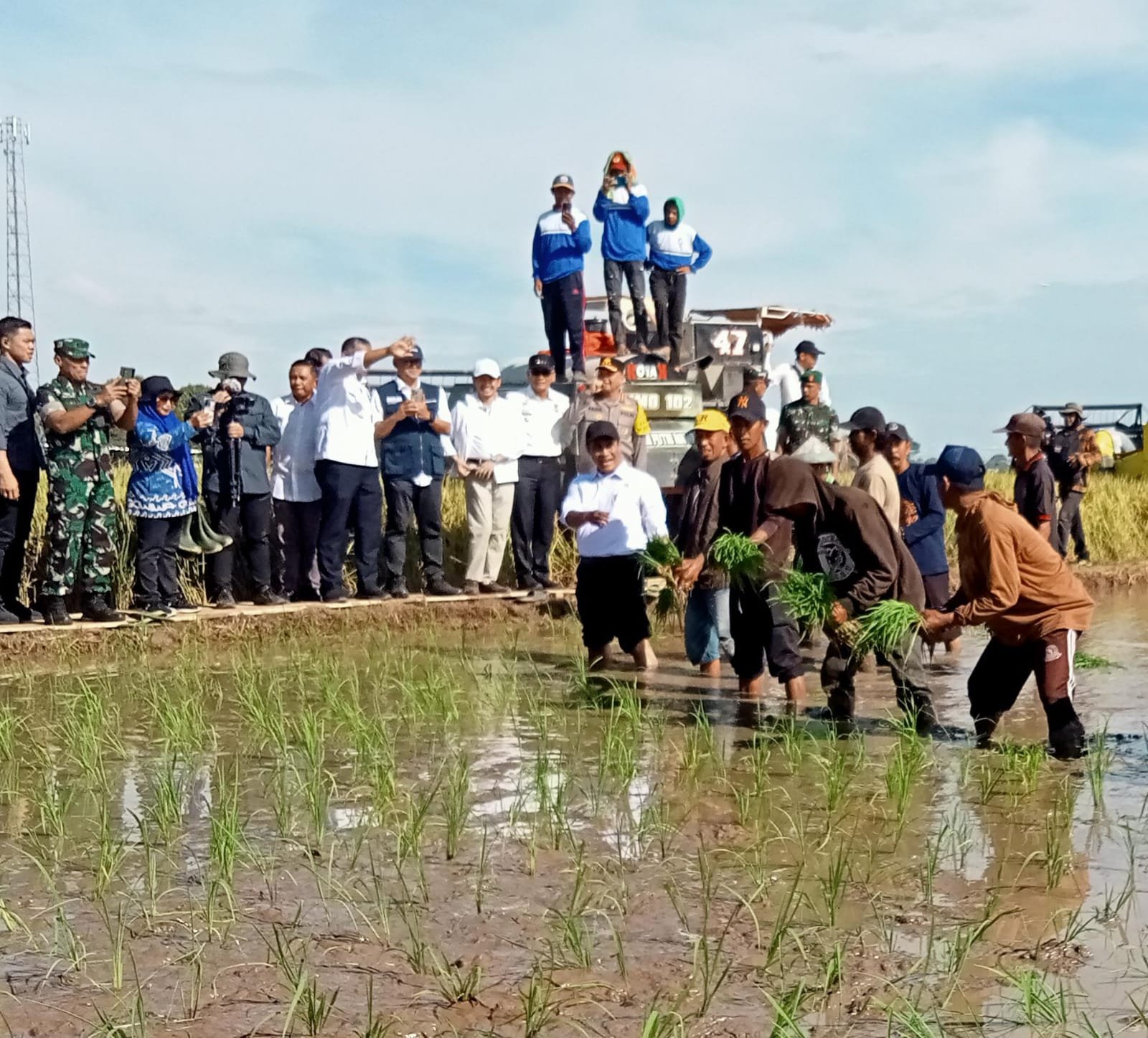 Tiba di lokasi Mentan Amran langsung turun ke sawah bergabung dengan petani yang sedang menanam.