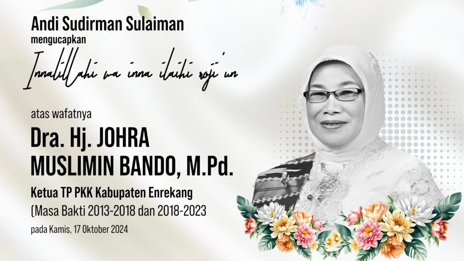 “Innalillahi Wa Inna Ilaihi Rajiun. Kami mengucapkan duka cita mendalam atas berpulangnya ke Rahmatullah, almarhumah Ibu Dra. Hj. Johra Muslimin Bando, M.Pd,” tuturnya.