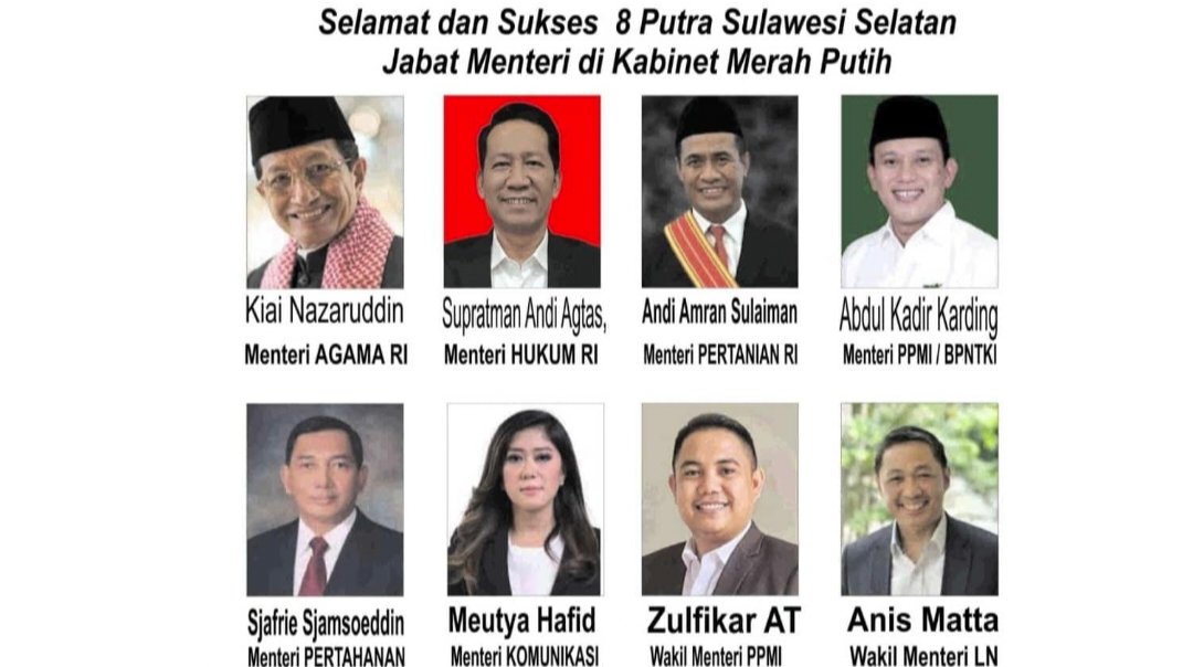 Diketahui, pada Kabinet Merah Putih ada sembilan orang yang berasal dari Sulsel. Yakni Menteri Pertanian Andi Amran Sulaiman, Menteri Hukum Supratman Andi Agtas, Menteri Agama Nasaruddin Umar, Menteri Pertahanan Sjafrie Sjamsoeddin, Menteri Perlindungan Pekerja Migran Abdul Kadir Karding, serta Menteri Komunikasi dan Digital Meutya Viada Hafid.