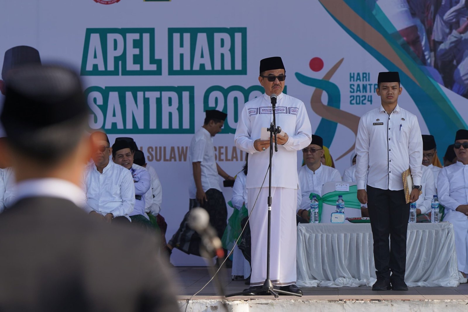 TEBARAN.COM,MAKASSAR – Sekretaris Daerah Provinsi Sulawesi Selatan Jufri Rahman menjadi Pembina Apel dalam pelaksanaan Apel Hari Santri Provinsi Sulawesi Selatan (Sulsel), yang digelar Kantor Wilayah Kementerian Agama Sulsel, di Lapangan Karebosi, Makassar, Selasa, 22 Oktober 2024.