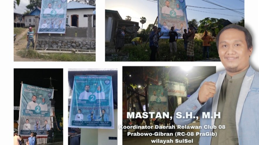 Koordinator Daerah Relawan Club 08 Prabowo-Gibran (RC-08 Pragib) Wilayah Sulsel Mastan mengatakan, “sekarang ini Tim RC-08 Pragib Wilayah Sulsel telah bersinergi dengan Tim Relawan Andalan-Hati dan telah memasang/Membuat Posko Pemenangan berapa Titik di Makassar dan berapa titik di Kabupaten Wilayah Sulsel,” ungkapnya.