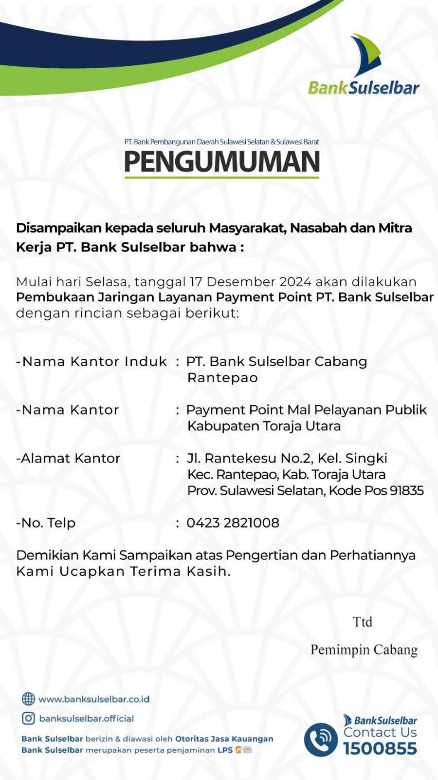 3. Layanan Payment Point Mal Pelayanan Publik Kabupaten Toraja Utara, Jl. Rantekesu No. 2, Kel. Singki, Kec. Rantepao, Kab. Toraja Utara, Sulsel. dan mulai beroperasi Selasa, tanggal 17 Desember 2024.
