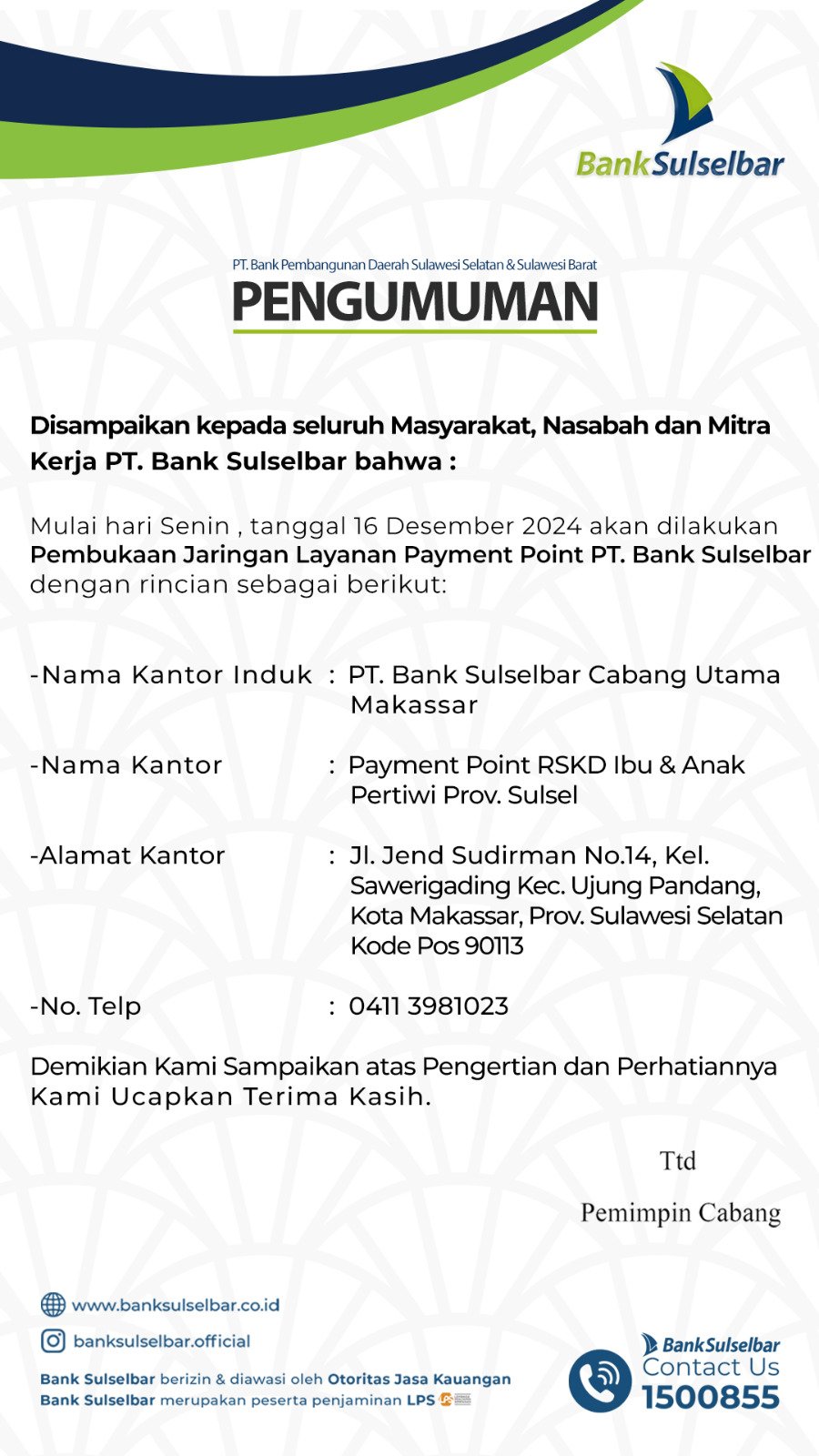 Bank Sulselbar Umumkan Pembukaan Layanan Payment Point Di Gowa, Makassar Dan Toraja Utara